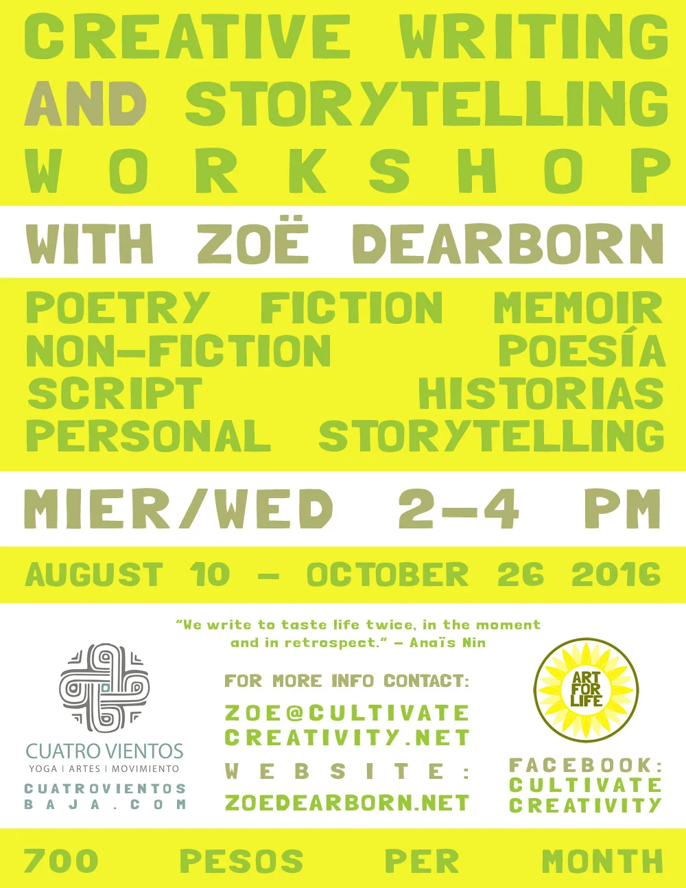 This workshop will be a great opportunity for you to write or tell your story, or commit to a summer writing project. The minimum commitment for this class is one month. It will be held on Wednesdays, 2-4 PM. One hour will be dedicated to writing, with prompts, suggestions and other inspiration. One hour will be used to focus on reading and giving feedback, as well as support and discussion.